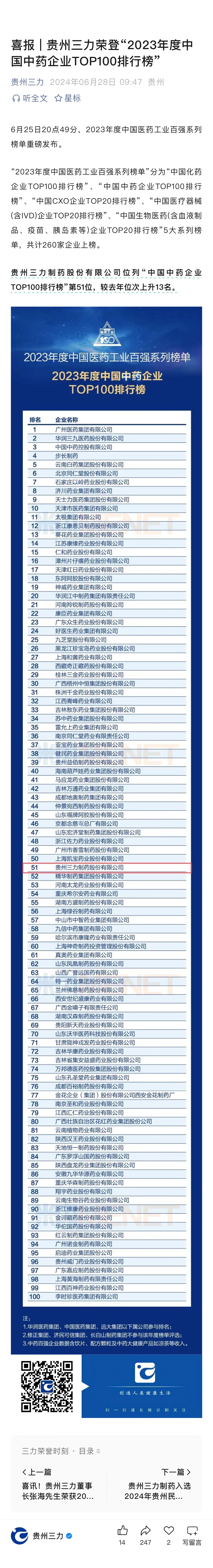 喜报|贵州三力荣登“2023年度中国中药企业TOP100排行榜