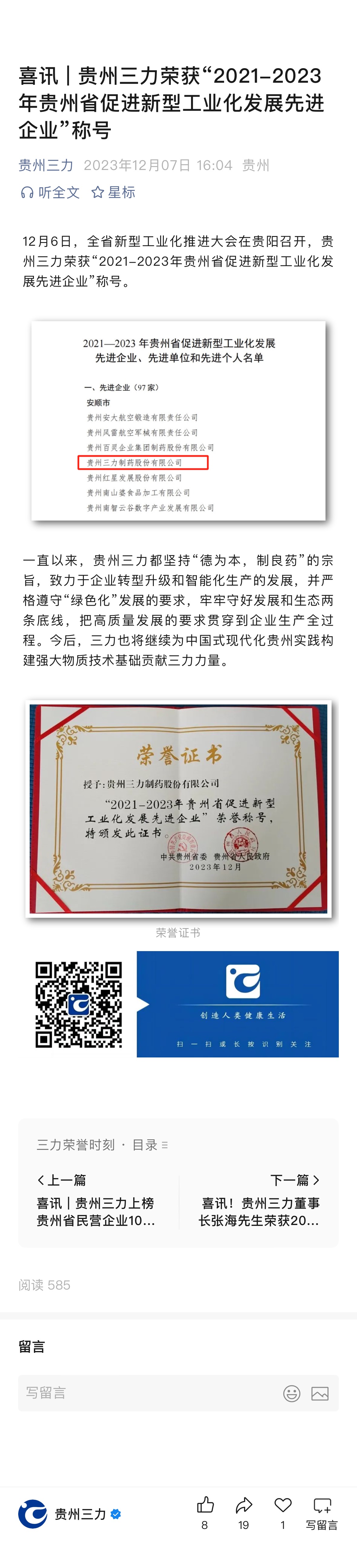 贵州三力荣获“2021-2023年贵州省促进新型工业化发展先进企业”称号