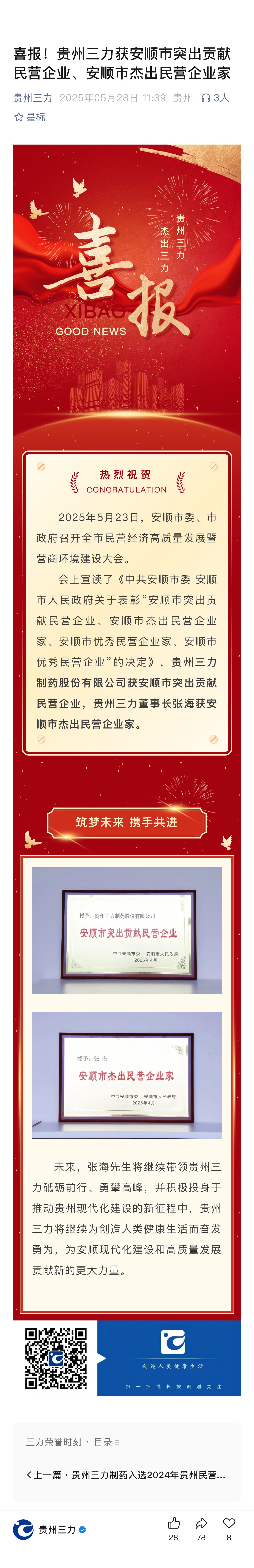 喜报!贵州三力获安顺市突出贡献民营企业、安顺市杰出民营企业家